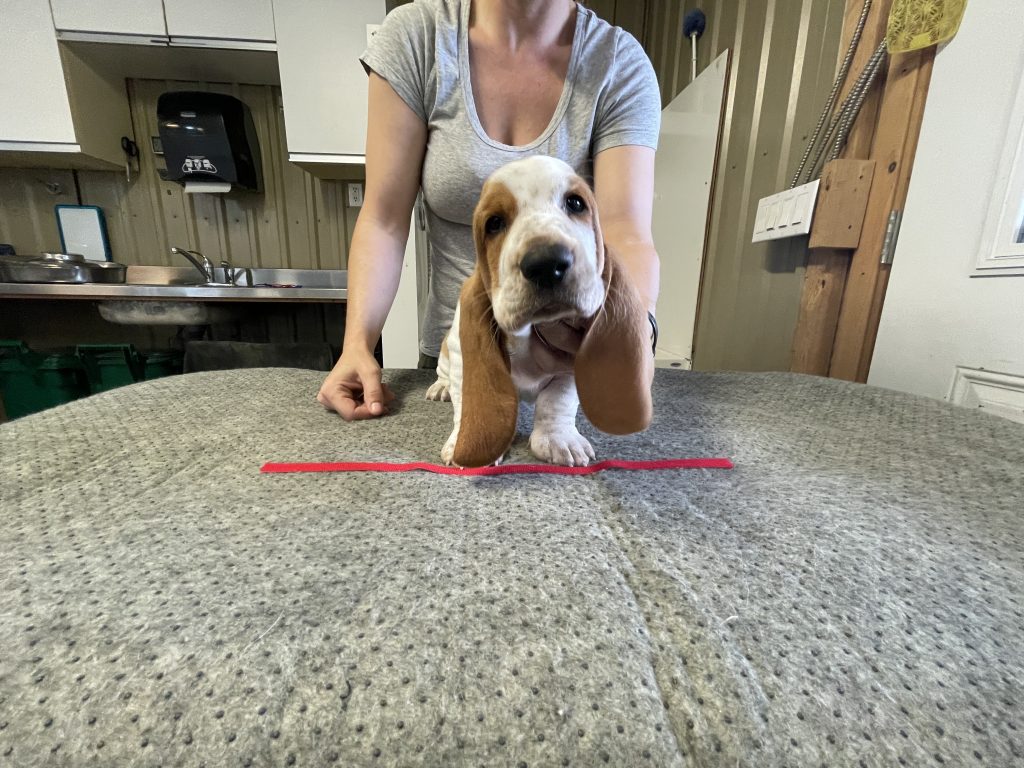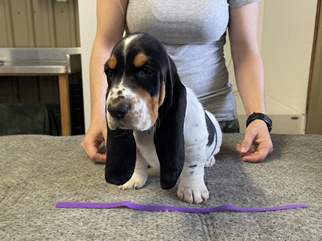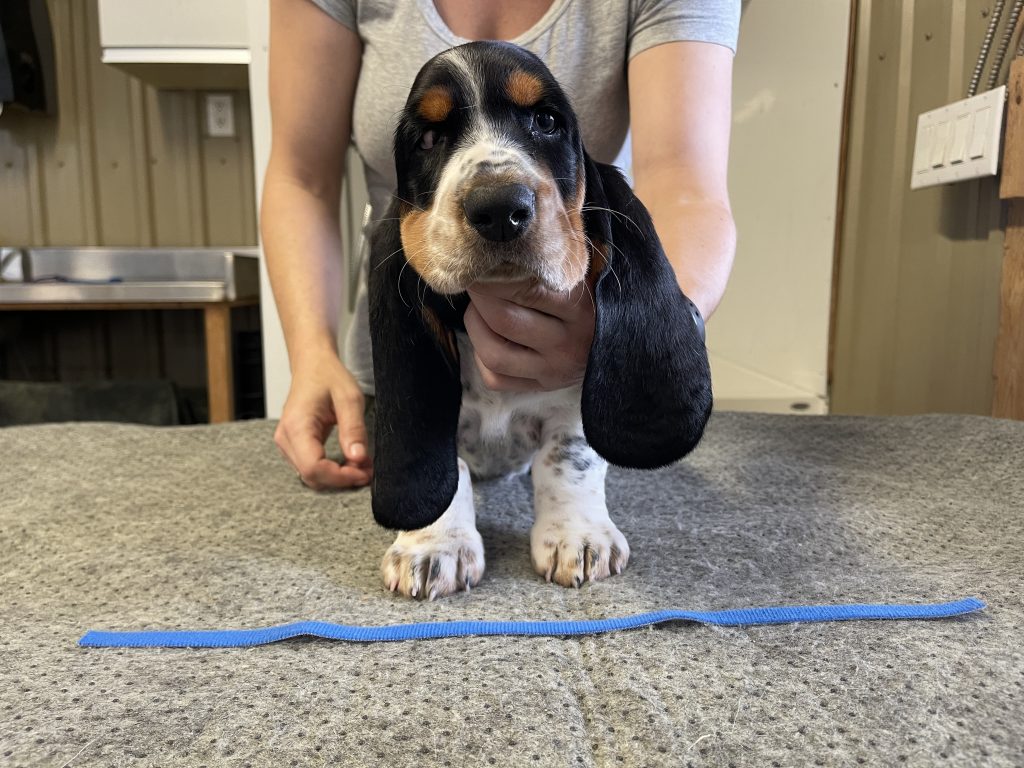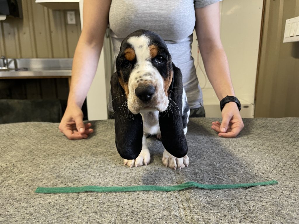 If you are interested in one of these pups please email me at mjg@goldenassetkennels.ca or fill out our Puppy Application  Our Basset Hound Puppies are sold on a first come first serve basis according to the waiting list. There is a $600.00 deposit to be added to our waiting list. When the puppy is born there is a $1150.00 deposit to hold the pup for you. There is another deposit of $1250.00 due when the pups are 4 weeks of age. All deposits are non refundable. The balance is due on pick up day. If you are interested in a basset hound pup from our litter, please email me for more information. mjg@goldenassetkennels.ca or give me a call at 705-440-7644. Or you can fill out our Puppy Application  Prices for one of our Basset Hound puppies is $3700.00 plus taxes.  Plus $95.00 when the puppy goes home for a 35 pound bag of food that that the puppy is already started on.